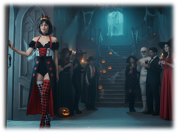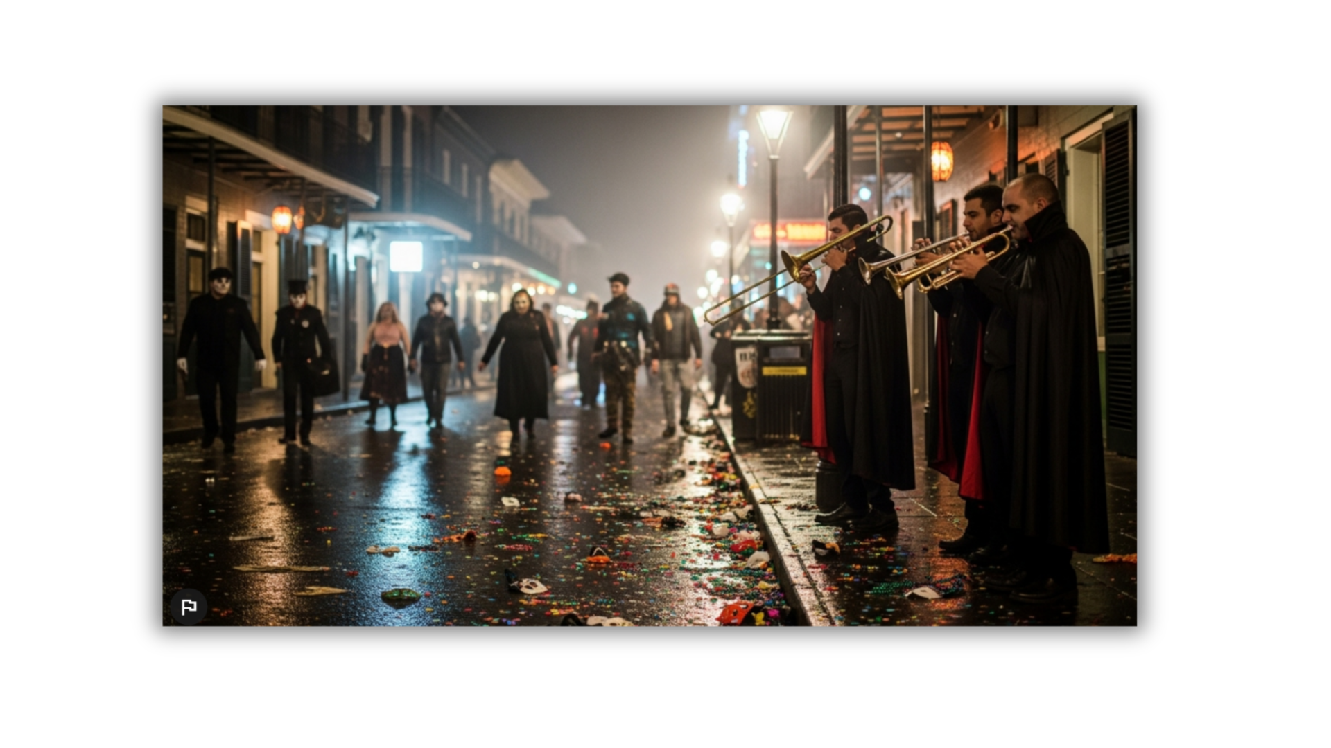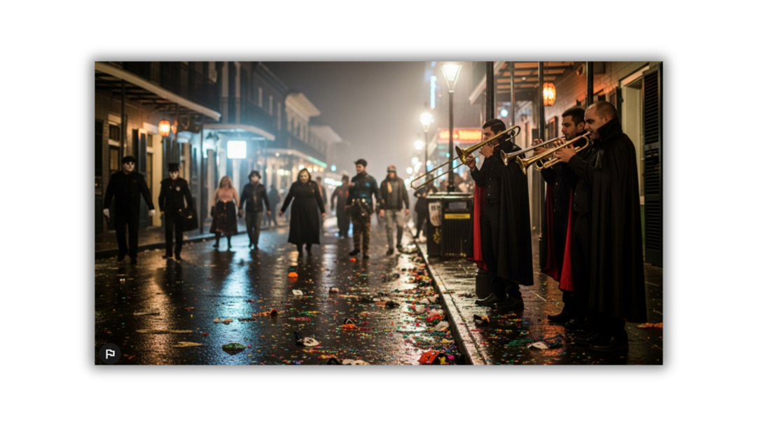 Midnight draped itself over New Orleans in flickers of orange and shadow. The streets pulsed with leftover life — music spilling from half-empty bars, clusters of costumed stragglers laughing too loudly, their voices echoing through alleys lined with wrought-iron balconies and sagging cobweb decorations. Pumpkins still glowed on stoops, their candles burned low, while a humid breeze carried the mixed scent of sugar and smoke. Nearby, three jazz players in vampire capes leaned into their instruments beneath a flickering streetlamp, their music threading through noise and laughter.