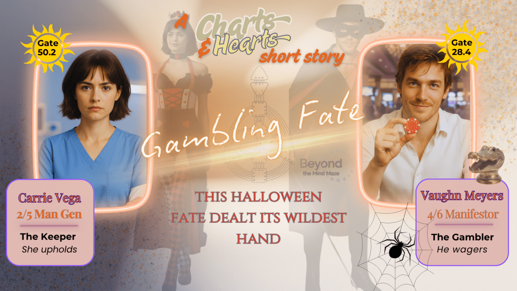 In Gambling Fate, a nurse driven by duty and a gambler driven by life’s risks find themselves caught in destiny’s game one Halloween night. This Human Design-inspired novelette can be read on its own — no background knowledge needed.