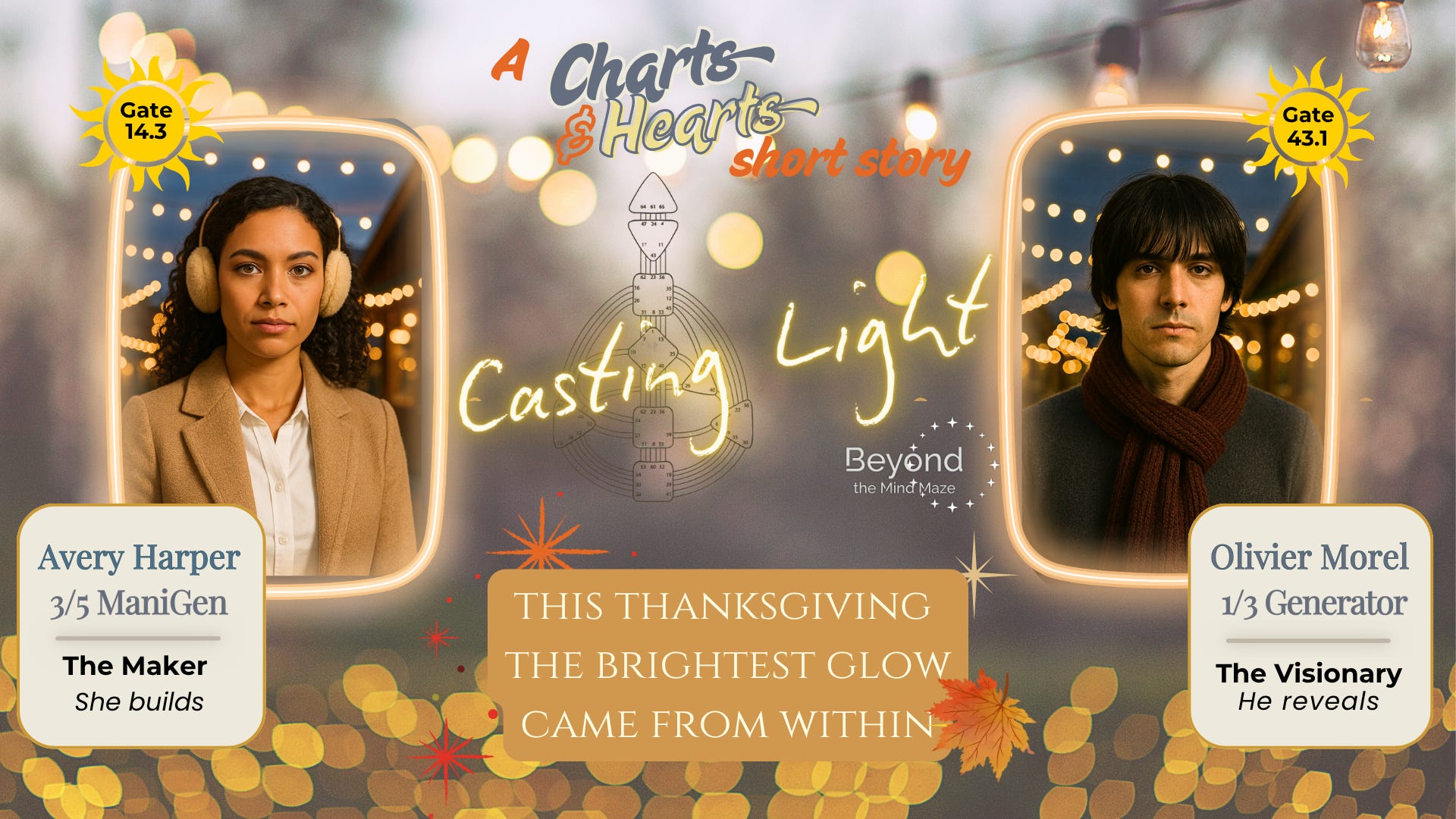 Avery carries the bold, experiential energy of a 3/5 Manifesting Generator—restless, hands-on, and always learning by diving straight into life’s messiest moments. Olivier, on the other hand, is a 1/3 Generator—steady, methodical, and quietly rebuilding his world one tested truth at a time. Together, they bridge experimentation and understanding, showing how insight meets motion when two very different designs find their rhythm.
